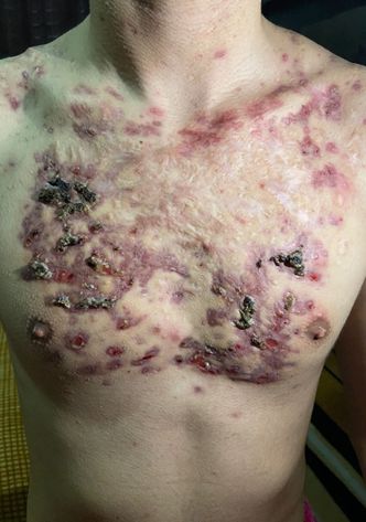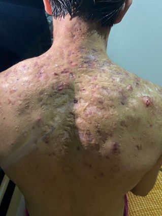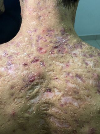 Manifestaciones Clinicas: los individuos afectados frecuentemente tienen un acné típico leva a moderado previo al inicio del acné fulminans. Las lesiones cutáneas rápidamente se vuelven inflamatorias y se carac terizan por ser similares al acné conglobata (abscesos y nódulos que drenan material purulento, túneles fistuli zados con cicatrización rápida y grave); placas friables, costras hemorrágicas y escaras necróticas sumamen te adheridas y dolorosas que dejaran cicatrices principalmente hipertróficas en pecho y bordes maxilares. Las regiones facial y cervical son poco involucradas. Tronco, espalda y brazos lo presentan con mayor fre cuencia. Las lesiones ulceradas conllevan cicatrices significativas. Puede presentarse con o sin síntomas sistémicos como fiebre y poliartritis (acné fulminante sine fulminans),
