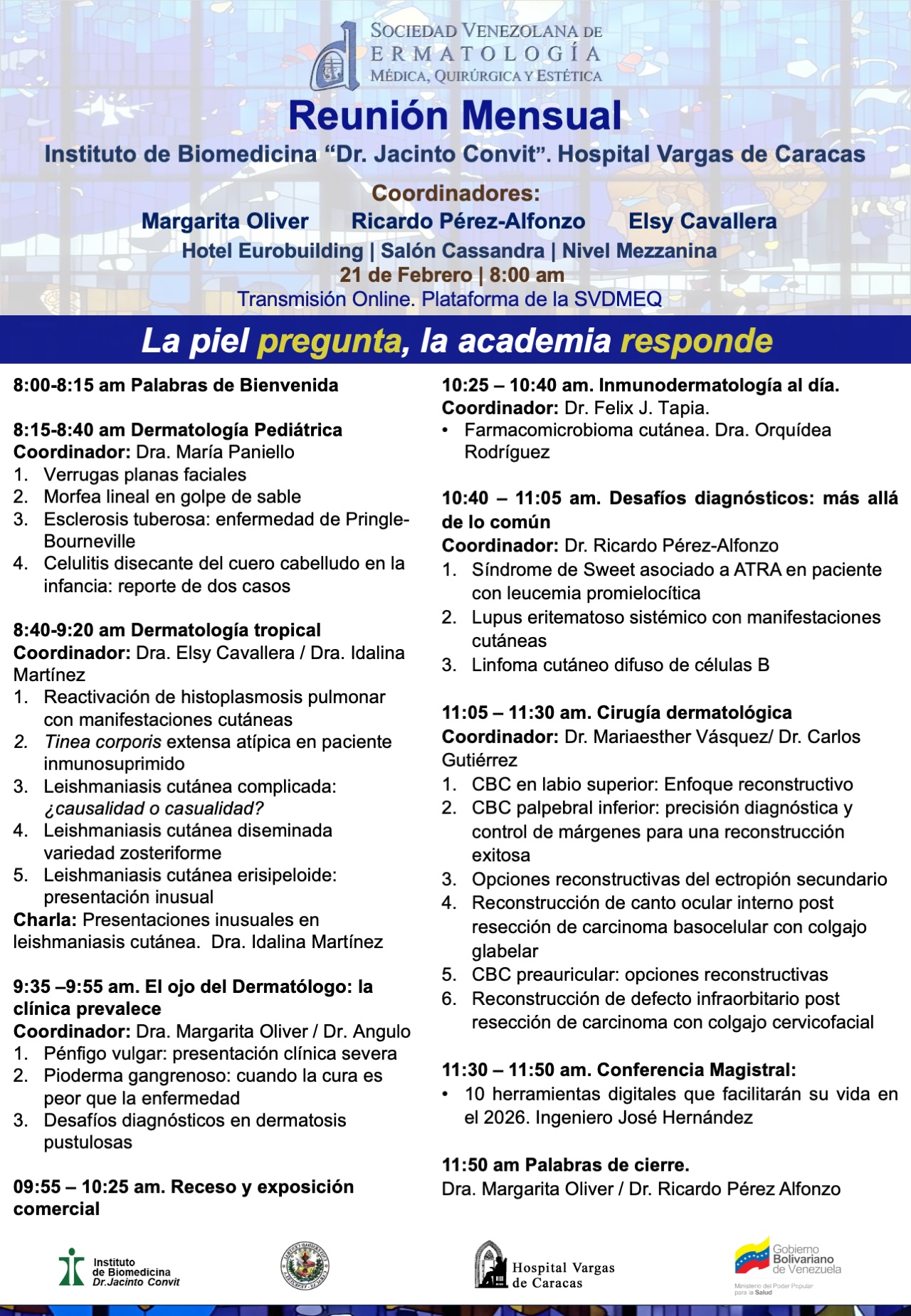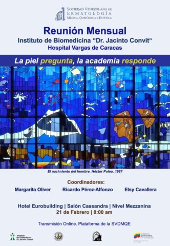 Durante la mañana del pasado sábado 21 de febrero, se llevó a cabo la primera reunión mensual de la Sociedad Venezolana de Dermatología Médica, Quirúrgica y Estética, correspondiente al Instituto de Biomedicina/Hospital Vargas de Caracas.